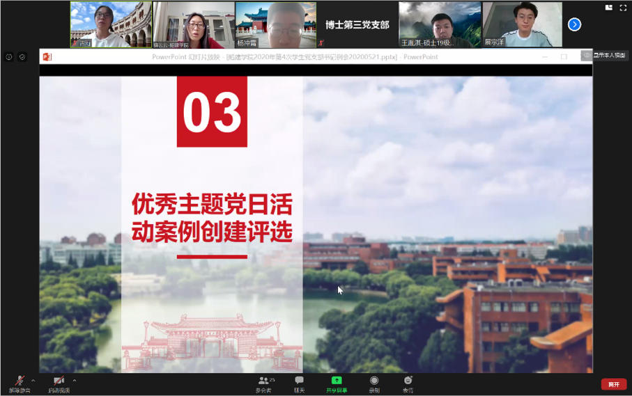 随后,七位学生党支部书记代表通过PPT展示分享了支部近期工作要点、亮点和未来工作计划,对近期支部工作做阶段性总结。各党支部的工作各具特色,形式新颖,内容充实,为其他支部提供了参考和借鉴。
