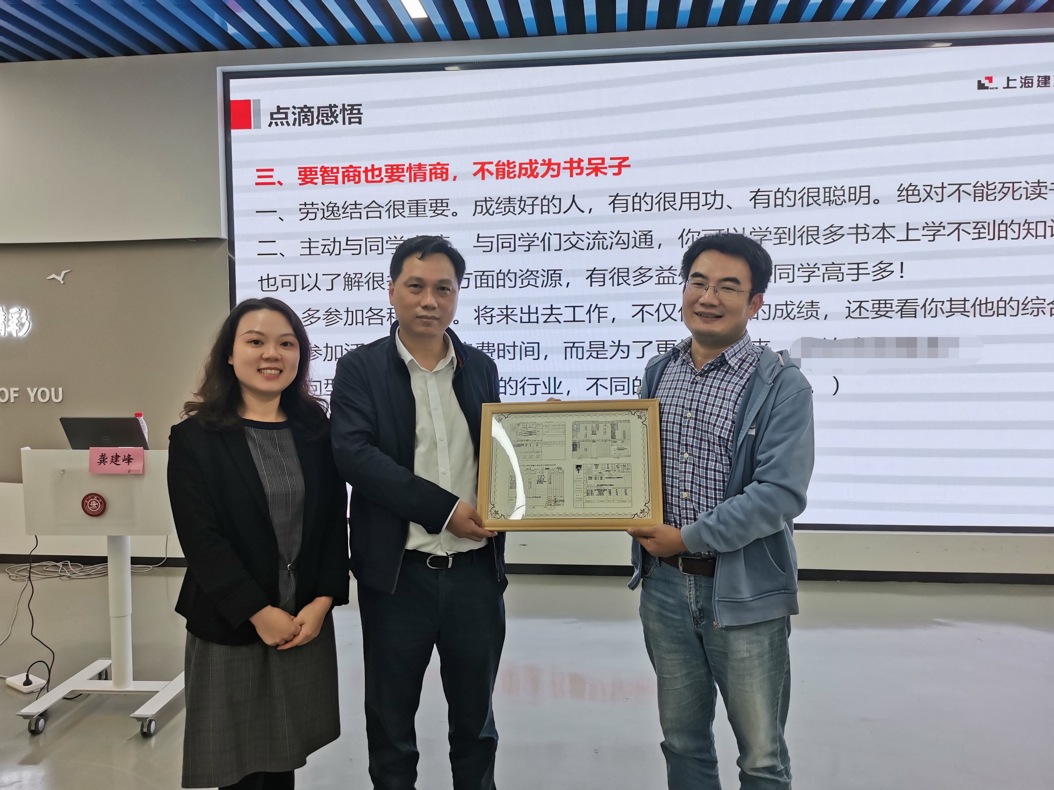 接着,龚建峰分享了自己毕业后的工作经历。龚建峰先后在上海市政工程设计研究总院(集团)有限公司和上海建工设计研究总院有限公司工作,参与设计了上海南北高架路延安路立交、卢浦大桥、长江第一桥、宁波明州大桥、上海迪士尼、上海交通大学新建闵行北校区博士生公寓等工程。结合自己的工作感悟,龚建峰给学生提出了四条建议:工程力学系提供了扎实的数学和力学基础,这对今后的工作受益匪浅;既要锻炼智商也要锻炼情商,业余时间多和他人交流,向他人学习;相信母校交大的影响力,这是毕业的学长学姐用实干做出来的口碑,在校学生毕业后也要用心维护,发扬光大;选择了的道路要坚持走完。最后龚建峰学长以林忠钦校长在2020年毕业典礼上的发言“担当有为,砥砺前行”作为结束,勉励到场同学继续努力。