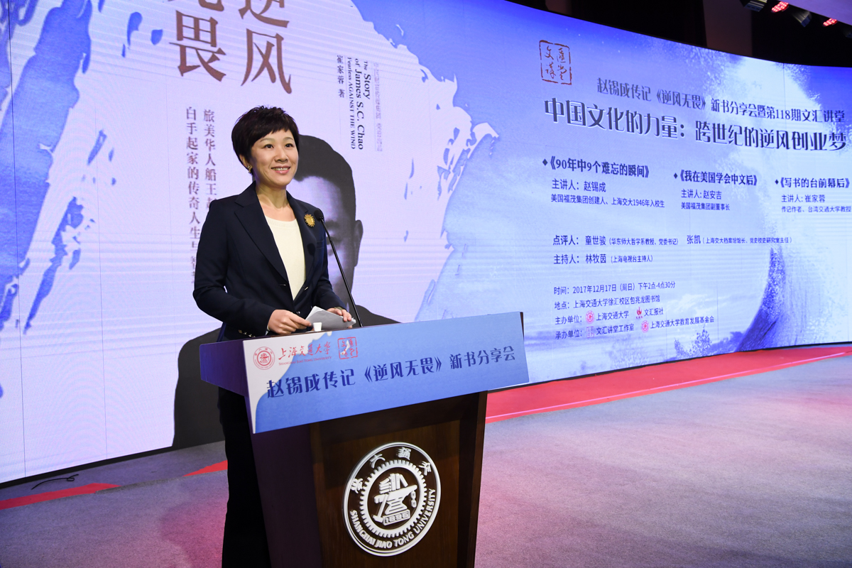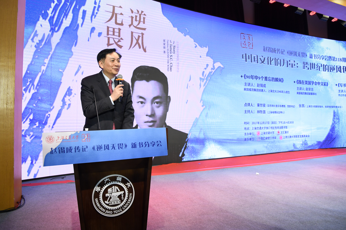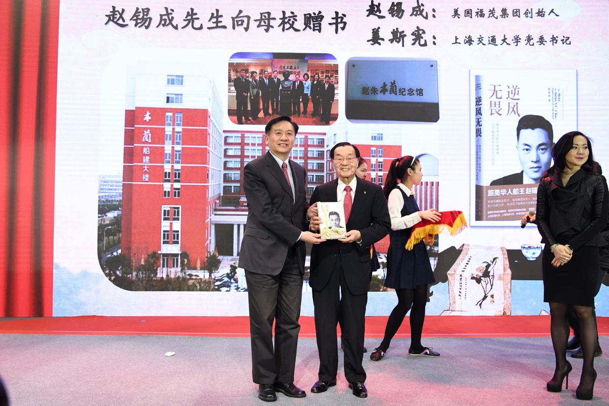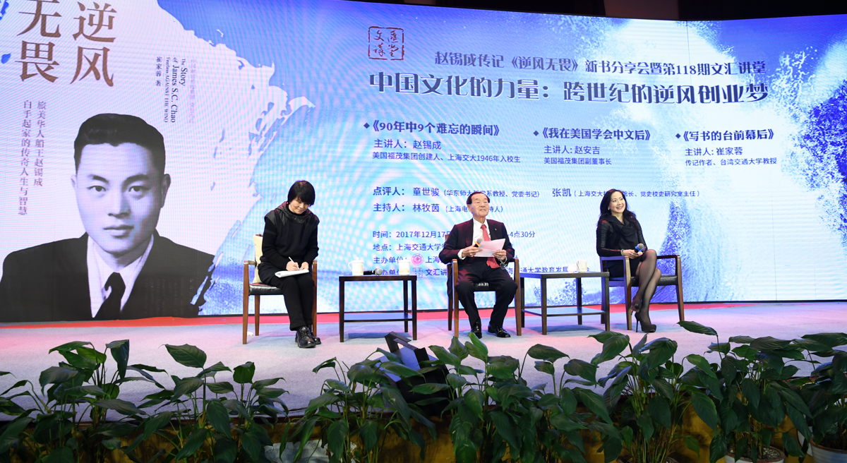 丁酉岁末,暖阳融融,游子归家,思源不辍。12月17日,古朴清幽的徐汇校区包兆龙图书馆演讲厅迎来了著名校友、旅美华人船王、福茂集团董事长赵锡成学长,六女儿、福茂集团副董事长赵安吉女士,传记作者、台湾交通大学教授崔家蓉女士一行,做客文汇讲堂,与母校师生及广大读者分享人生经历,共话家国情怀。市人大常委会副主任、校党委书记姜斯宪,党委常委、副校长张安胜表达了全校师生对赵学长及亲友一行的热烈欢迎。市政协对外友好委员会、市侨办、市公共外交协会、市海峡两岸交流促进会、市台办及高校代表出席新书发布会。本次活动由上海交通大学、文汇报社联合主办。上海电视台资深主持人林牧茵主持活动。