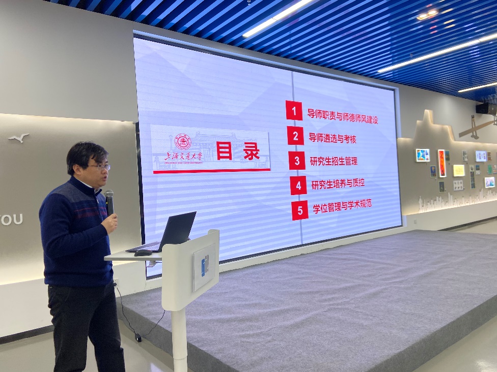 宋续明从学生工作的角度,结合实际案例介绍了研究生培养中的导师责任,主要从导师立德树人的职责、关心关爱学生保障安全稳定、聚焦人才培养积极就业引导、做好人生导师构建和谐导学关系等方面进行了介绍,建议导师们以身作则,成为学生的人生标杆和道德示范。