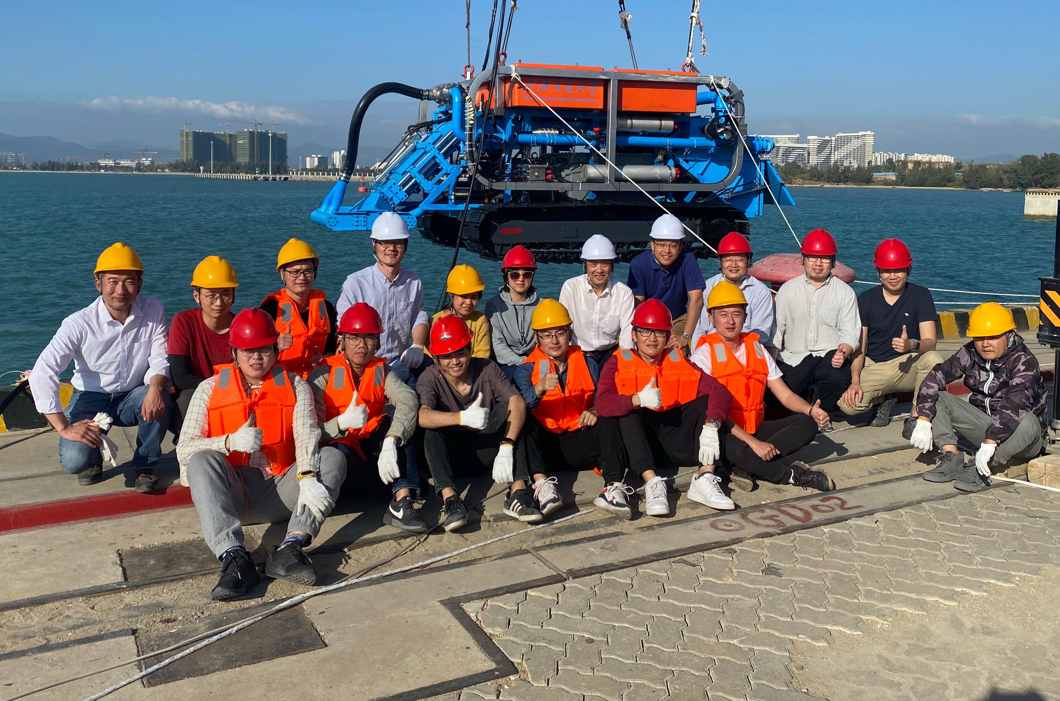 该深海重载作业采矿车是海洋工程团队研制的首台样机,以深海多金属结核为开发作业对象,长5.6米,宽2.5米,高2.0米,空气中重量8.0吨,设计作业水深3000米,行进速度1.0米/秒。海洋工程团队发明了高效水力集矿系统,集矿高度与角度可根据地形起伏自适应调节,创新研发多源信息融合与反馈控制、海底图像增强识别等技术,采矿车综合性能指标达到国内先进水平。