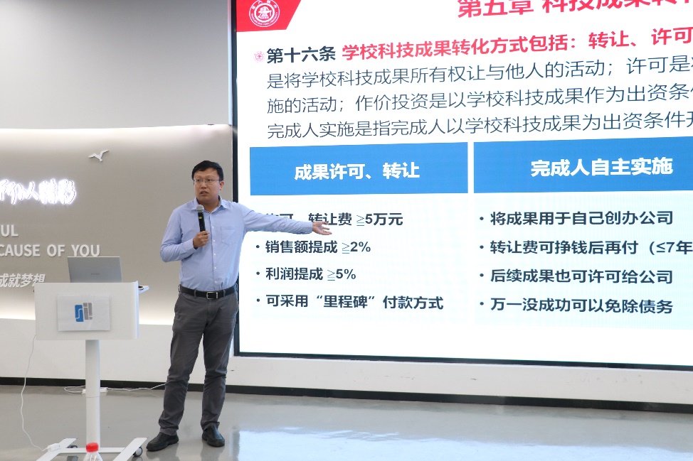 任何科学技术、创意和想法,未来都有可能涉及到产业转化和科技创业。为此,本次论坛特别邀请了上海闵行交大科技园运营有限公司副总经理、上海交通大学科技成果转化专员郭超作了题为《新时期成果转化政策和大零号湾推进情况》的报告。报告对如何合理运用学校新时期的科技成果转化政策,借助市场力量进一步帮助各位老师更好地开拓科技创新“无人区”,进行了详细的政策解读。