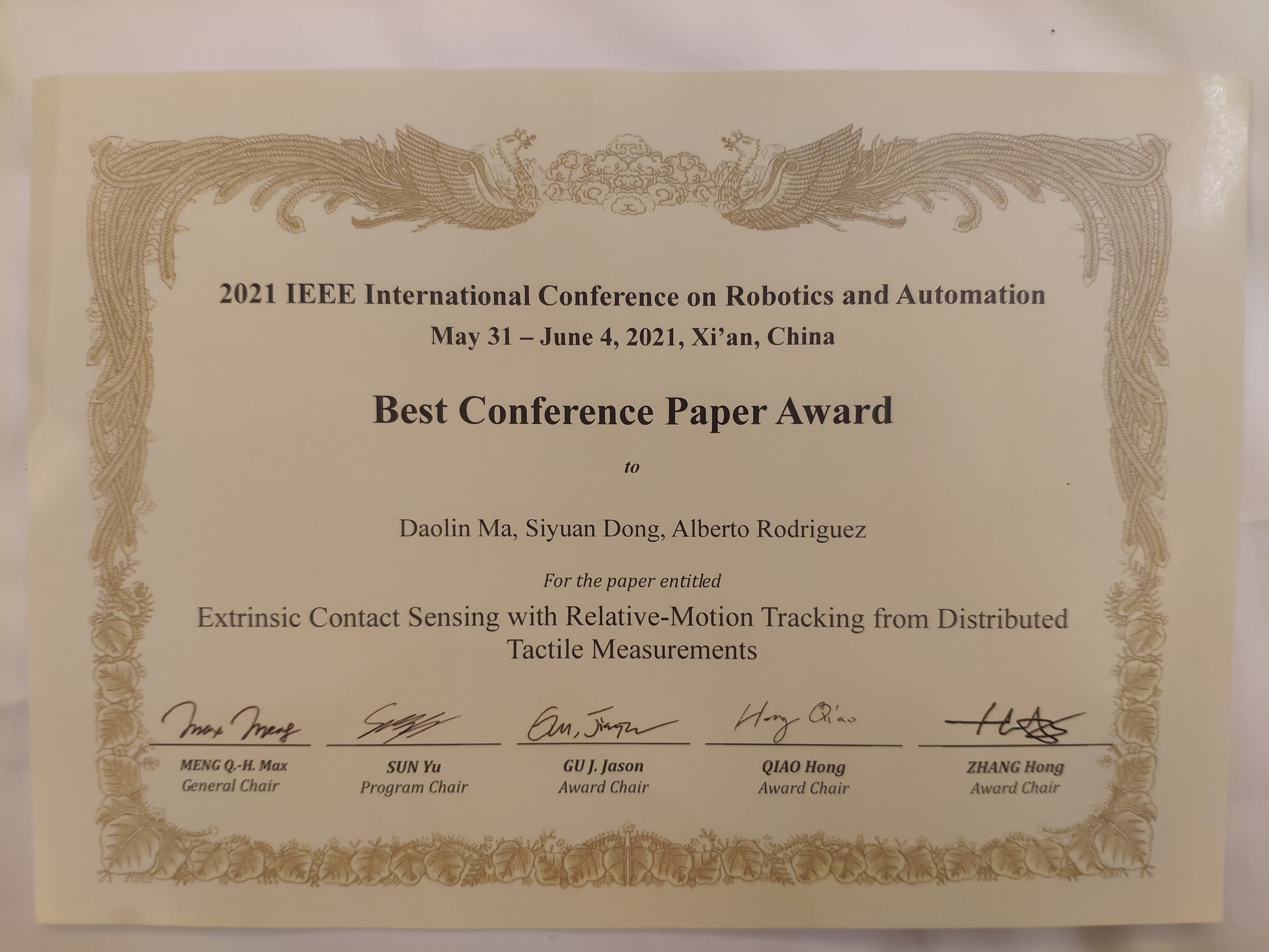 马道林现为上海交大凯发官网 工程力学系副教授,主要从事机器人操作及触觉感知与控制领域的前沿研究工作,曾荣获2017年Amazon机器人挑战赛Stow Task冠军和Amazon机器人最佳系统论文奖。 ICRA(International Conference on Robotics and Automation)由IEEE(Institute of Electrical and Electronics Engineers)主办,历史悠久,许多机器人和自动化领域最重要的革新最初都是在ICRA上面世。随着机器人和自动化在社会经济方面的影响越来越大,ICRA也越来越倾向于增加以产业化为中心的活动和内容。 IEEE ICRA 最佳会议论文奖(始于 1993 年)选出年度 IEEE 机器人与自动化国际会议(ICRA)中最杰出的论文,今年ICRA共收到4056篇投稿论文,从中遴选出4篇进入最终入围名单,并最终有1篇论文获得最佳论文奖。