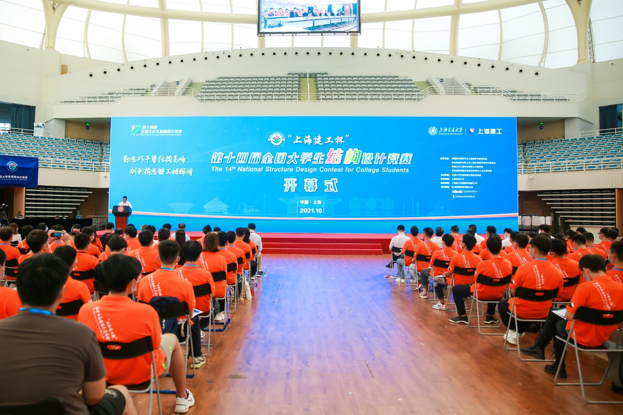 2021年10月14日下午,“上海建工杯”第十四届全国大学生结构设计竞赛开幕式在上海交通大学闵行校区霍英东体育中心顺利举行,并同步设置线上会场。此次大赛由中国高等教育学会工程教育专业委员会、教育部高等学校土木工程专业教学指导分委员会、中国土木工程学会教育工作委员会和教育部科学技术委员会环境与土木水利学部指导,由全国大学生结构设计竞赛委员会主办,上海交通大学承办,上海建工集团股份有限公司冠名。北京迈达斯有限公司、北京筑信达工程咨询有限公司、杭州邦博科技有限公司为大赛支持单位。