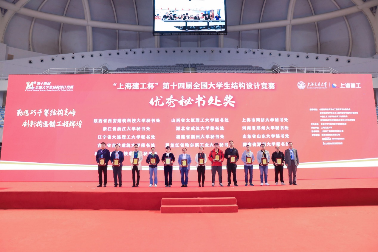 经全国大学生结构设计竞赛专家委员会、秘书处和承办方共同研究决定,授予陕西省西安建筑科技大学秘书处等13所高校秘书处“优秀秘书处奖”;授予安徽建筑大学等34所高校“优秀组织奖”;授予上海交通大学“高校突出贡献奖”;授予上海建工集团股份有限公司“全国大学生结构设计竞赛锦旗”;授予“北京迈达斯技术有限公司”等3家企业“卓越育人单位奖”。
