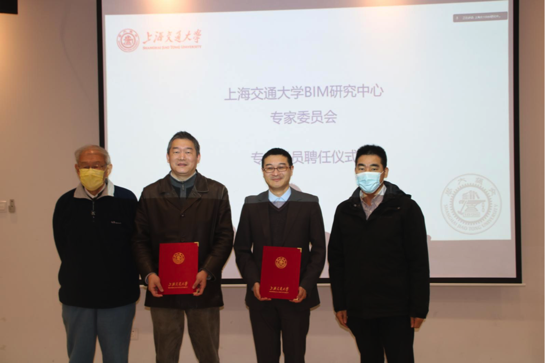 随后进行了上海交通大学BIM研究中心专家委员会新增专家委员聘任仪式,由上海交大BIM研究中心主任刘西拉、执行主任邓雪原给线下参与本次活动的两位专家委员(上海市城市建设设计研究总院数字中心主任杨海涛、上海江欢成建筑设计有限公司总建筑师程之春)颁发聘书。