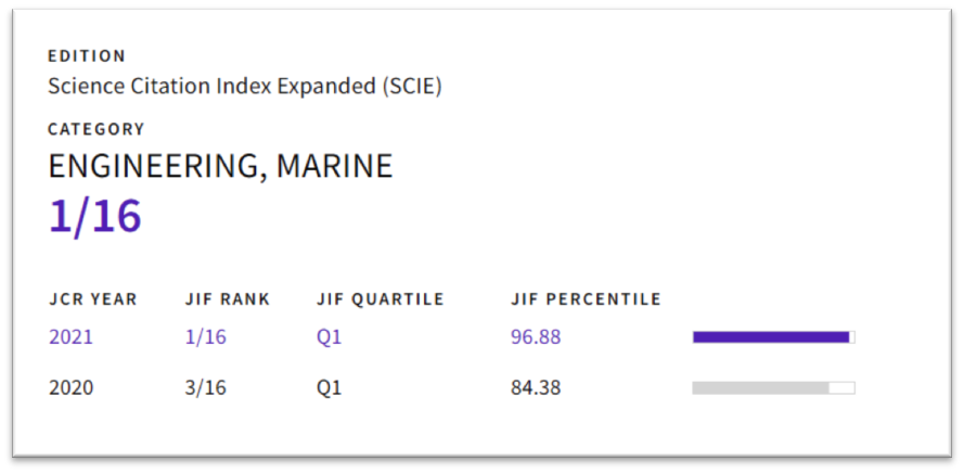 通过以上出色工作,JOES期刊先后取得了一系列骄人成绩。期刊先后成功入选了ESCI、Scopus、INSPEC等国际著名检索数据库。2020年12月,JOES期刊首次被SCIE数据库收录,正式成为SCI源期刊。2021年6月,在科睿唯安公布的2020年度《期刊引证报告》中,JOES期刊影响因子达到3.408,直接进入Q1区,在船舶与海洋工程领域的所有40本SCI和ESCI期刊中,跻身前5名,成功实现了跨越式发展。2022年6月,JOES期刊创办仅短短6年来,影响因子即跃居世界首位,打破了半个多世纪以来,欧美强国对船海领域世界一流学术期刊的垄断地位,也改变了学术期刊自创刊以来,至少需要十数年长期艰苦努力方可跻身世界一流期刊行列的传统惯例,在国内外学术界产生了较大影响。