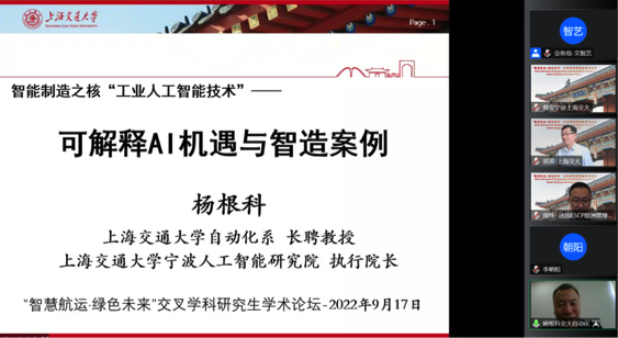 9月17日-18日,由上海交通大学研究生院立项支持、凯发官网-凯发KAIFA 主办、交通运输工程系承办的“智慧航运·绿色未来”交叉学科研究生学术论坛(IPIF-SSGF 2022)以在线方式成功举办。来自国内外多家交通、航运专业相关高等院校、科研院所等单位的学者在云端交流探讨,围绕“智慧航运·绿色未来”分享学术成果。