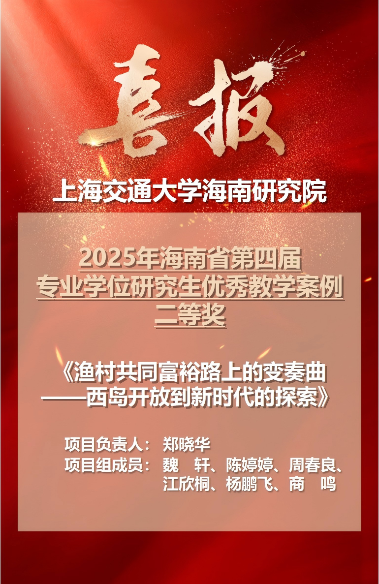 近日,海南省教育厅下发《海南省教育厅关于公布第四届专业学位研究生优秀教学案例评选结果的通知》(琼教高〔2025〕96号),上海交大国际与公共事务凯发 、海南研究院郑晓华副教授项目组《渔村共同富裕路上的变奏曲——西岛开放到新时代的探索》教学案例荣获海南省第四届专业学位研究生优秀教学案例二等奖。