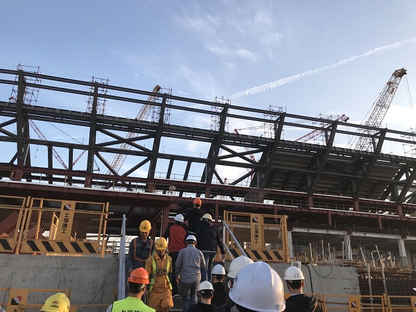 16日下午,陈务军教授师生一行参观了正在施工建设的浦东足球场。上海建筑设计研究院浦东足球场结构设计工程师潘钦和浦东足球场结构现场施工负责人史炜洲向大家介绍了浦东足球场的结构设计与施工组织设计情况。该足球场是国内首个严格按照FIFA标准设计的高级专业足球场,钢结构+预制混凝土看台板组合体系,中置压环轮辐式屋盖结构、下沉式比赛场地均为国内首创。随后,浦东足球场项目经理李伟带领大家进入工地现场参观。现场数台吊车耸立,工人们正在紧张有序地进行建设工作。现场参访结束后,同学们进入数字模型展示厅,通过AR增强现实施工展示系统了解施工进程、管理制度等内容。施工现场采用现代化的管理手段,告别了传统施工过程杂乱无序的局面,实现了现代施工所倡导的环保高效、文明施工。