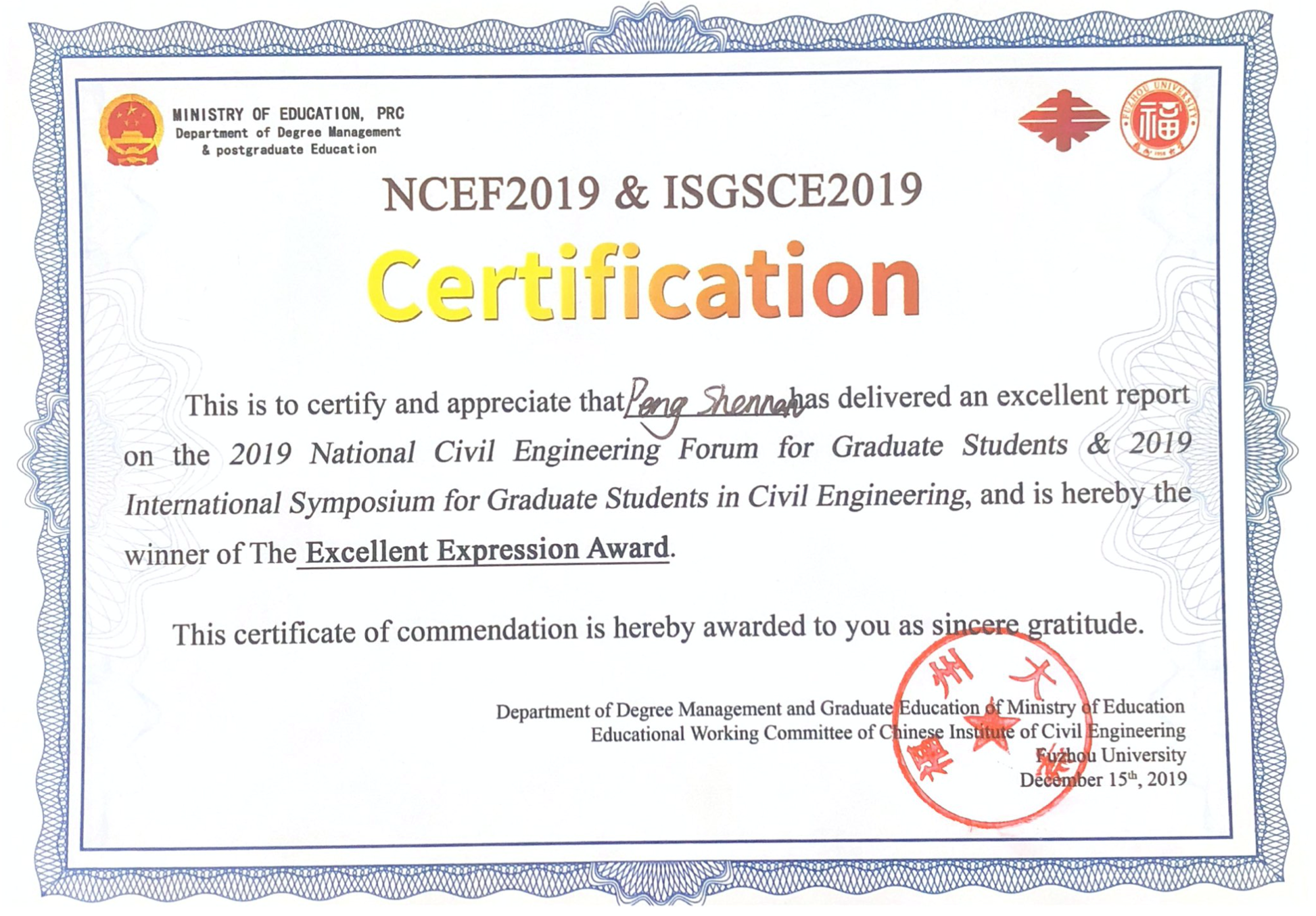 2019年全国土木工程研究生学术论坛(NCEF)暨2019年土木工程研究生国际交流会(ISGSCE)于2019年12月13至15日在福建省福州市召开。本次学术论坛邀请部分院士和专家学者,邀请国外知名专家和国内外土木工程领域优秀博士和硕士研究生参加,以“智慧土木工程的发展与挑战”为主题进行深入的学术交流与研讨。