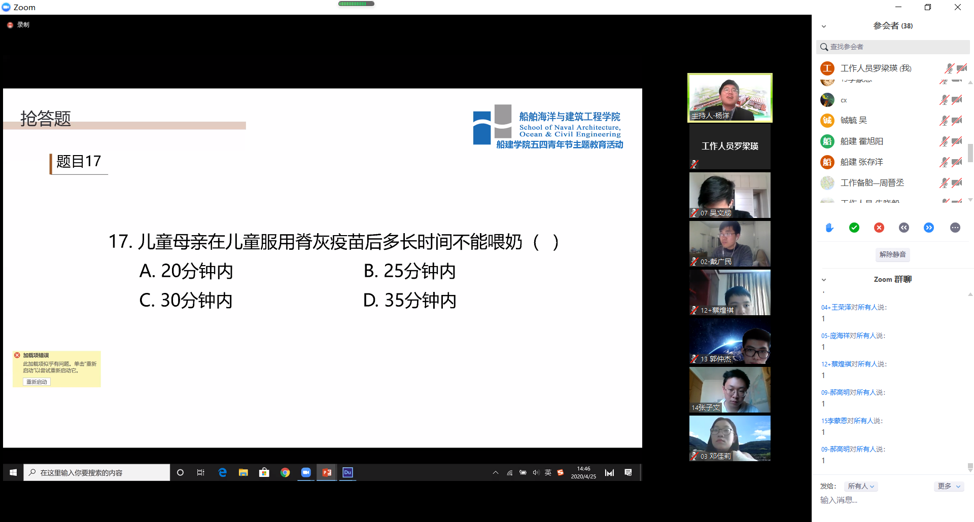 2020年4月25日下午两点,凯发官网 “舶鲸杯”知识竞赛在zoom会议室线上举行。本次“舶鲸杯”知识竞赛旨在鼓励船建青年关心时事,留意生活,并且为大家科普一些公共卫生常识。