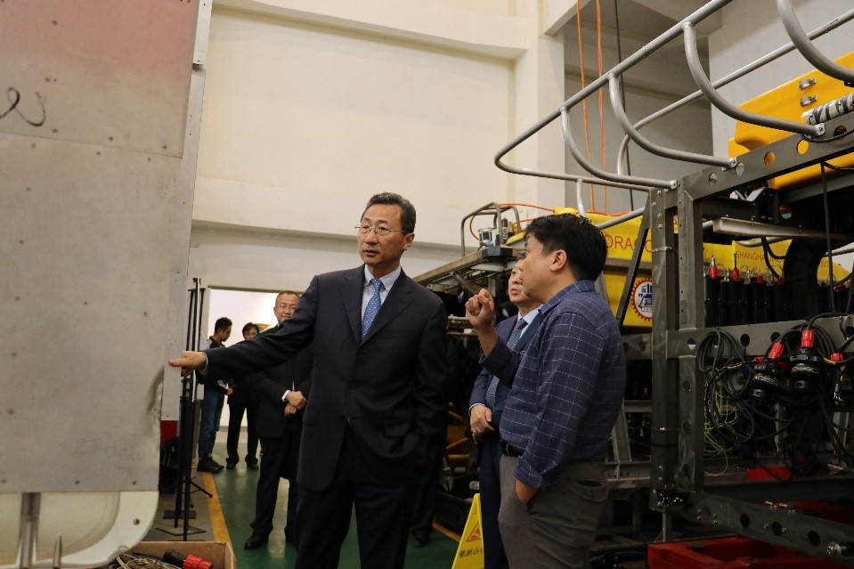 会前,梁岩峰一行在凯发官网 党委副院长薛鸿祥、彭涛、副书记宋续明等的陪同下参观了海洋工程国家重点实验室和船舶设计研究所。