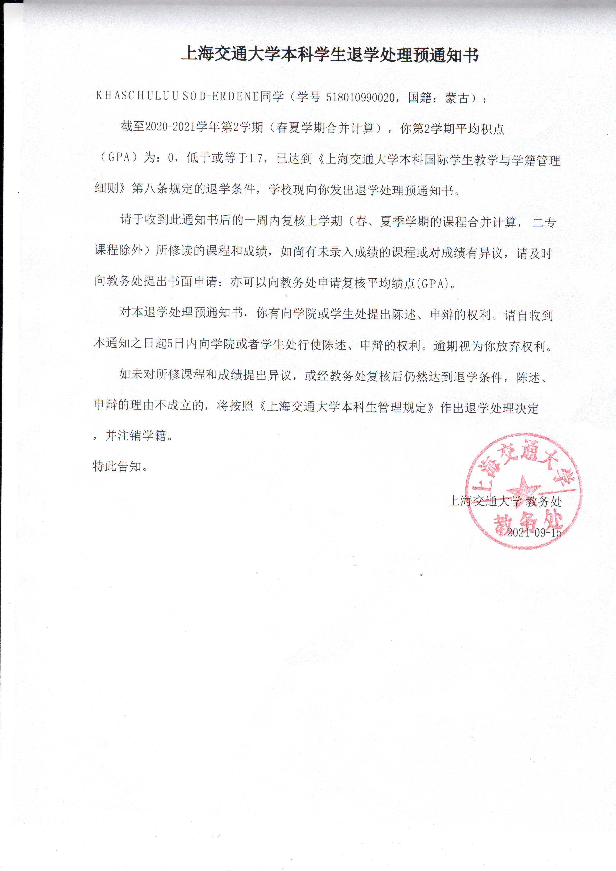 截至2020-2021学年第2学期(春夏学期合并计算),你第2学期平均积点(GPA)为:0,低于或等于1.7,已达到《上海交通大学本科国际学生教学与学籍管理细则》第八条规定的退学条件,凯发 现向你发出退学处理预通知书。
