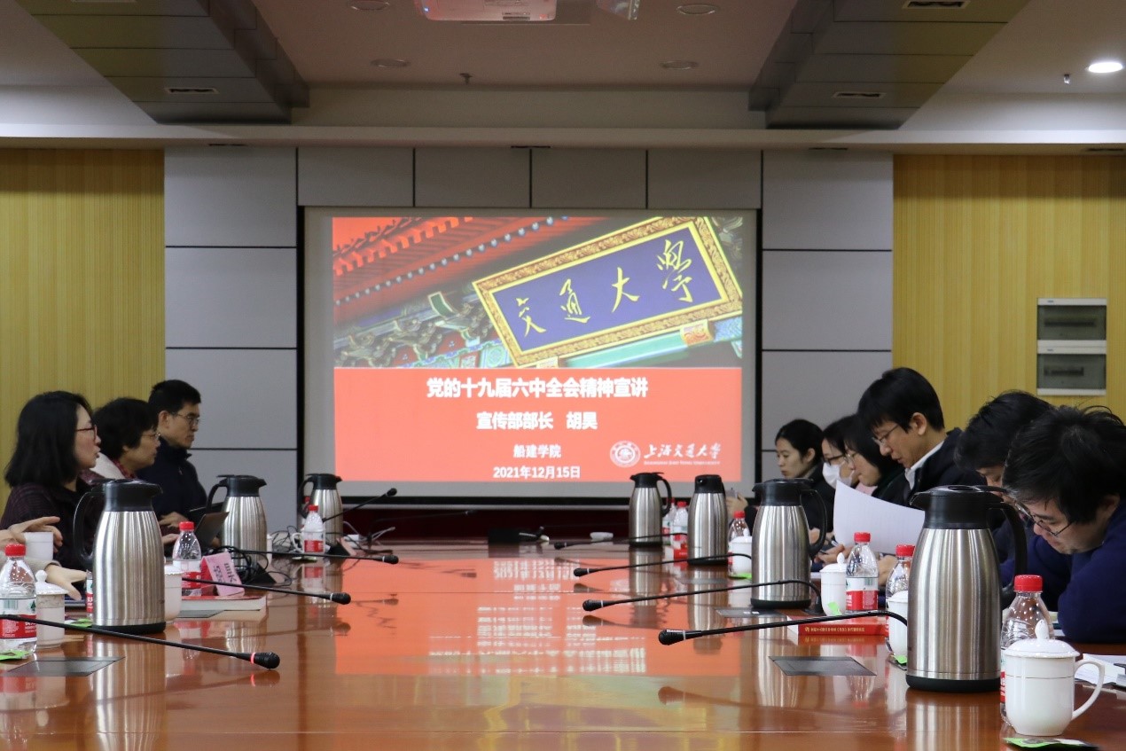 胡昊作十九届六中全会精神专题宣讲。胡昊阐述了十九届六中全会公报发布的十八大以来十三方面的成就,并对于第七方面成就——“文化成就”做详细展开介绍。他谈到,学校始终积极创建文明校园,打造思政育人大熔炉,强化三全育人;以文化传播,引领校园博文通达,结合艺术深耕理想信念教育,通过网络平台助力校园文化传扬;以文博育人,彰显传统文化之美,开展敦煌文化守望者志愿者计划等,持续加强宣传思想阵地建设。胡昊还深入分享了对于交大形象、精神谱系、校园文化现状、文化建设战略举措的学理性分析,交流了十四五规划大学文化建设着力点。他希望,以文化建设引领凯发 发展,将校史舞台剧《积厚流光》中的船建元素,黄旭华院士的山茶社纪念碑故事,上海交通大学首位共产党员烈士、土木系校友侯绍裘事迹等,进行深入学习和广泛传播,厚植船建人的家国情怀。