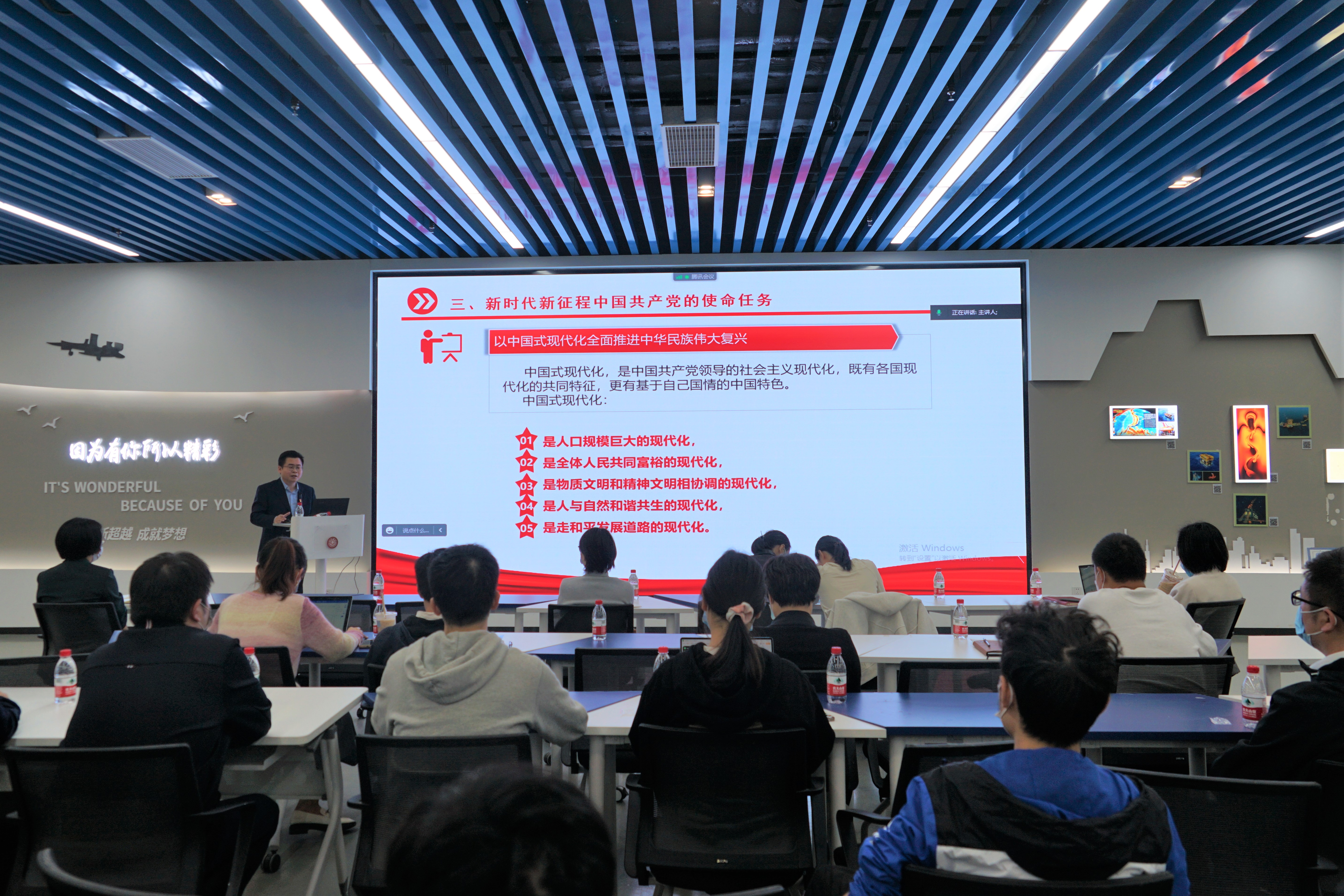 随后,黄庆桥教授聚焦“以中国式现代化全面推进中华民族伟大复兴”这一重点,从各国现代化的共同特征、为什么不能照搬西方模式、中国式现代化之路和中国式现代化深刻影响了世界历史进程四个方面进行分享。他指出,中国式现代化拓展了发展中国家走向现代化的途径,展现了世界社会主义的光明前景,创造了人类文明新形态。最后,他总结党的百年历史给我们的启示“承前启后,继往开来,一脉相承,与时俱进,接续发展,守正创新。”