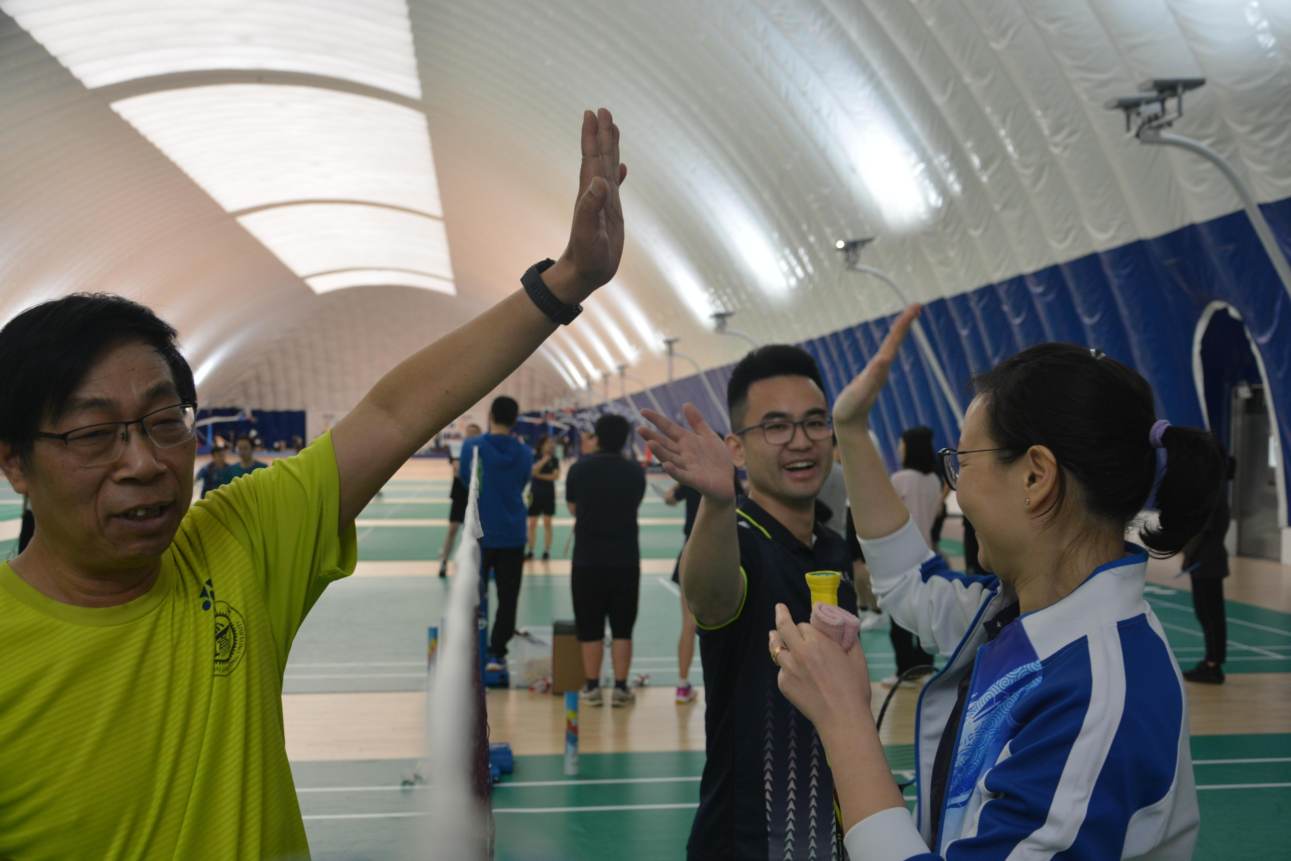 之后是“五羽轮比”趣味赛,由张卫刚、王喜芳、薛鸿祥和赵金城四位老师领队,现场招募选手组成四支五人组队伍,按照“五羽轮比”规则,一方获得10分后双方各替换一名选手进入下一局,以此类推,直到赢得50分。经过激烈的角逐,由薛鸿祥和张卫刚带领的队伍分别获得趣味赛第一、二名,赵金城和王喜芳带领的队伍分别获得三、四名。