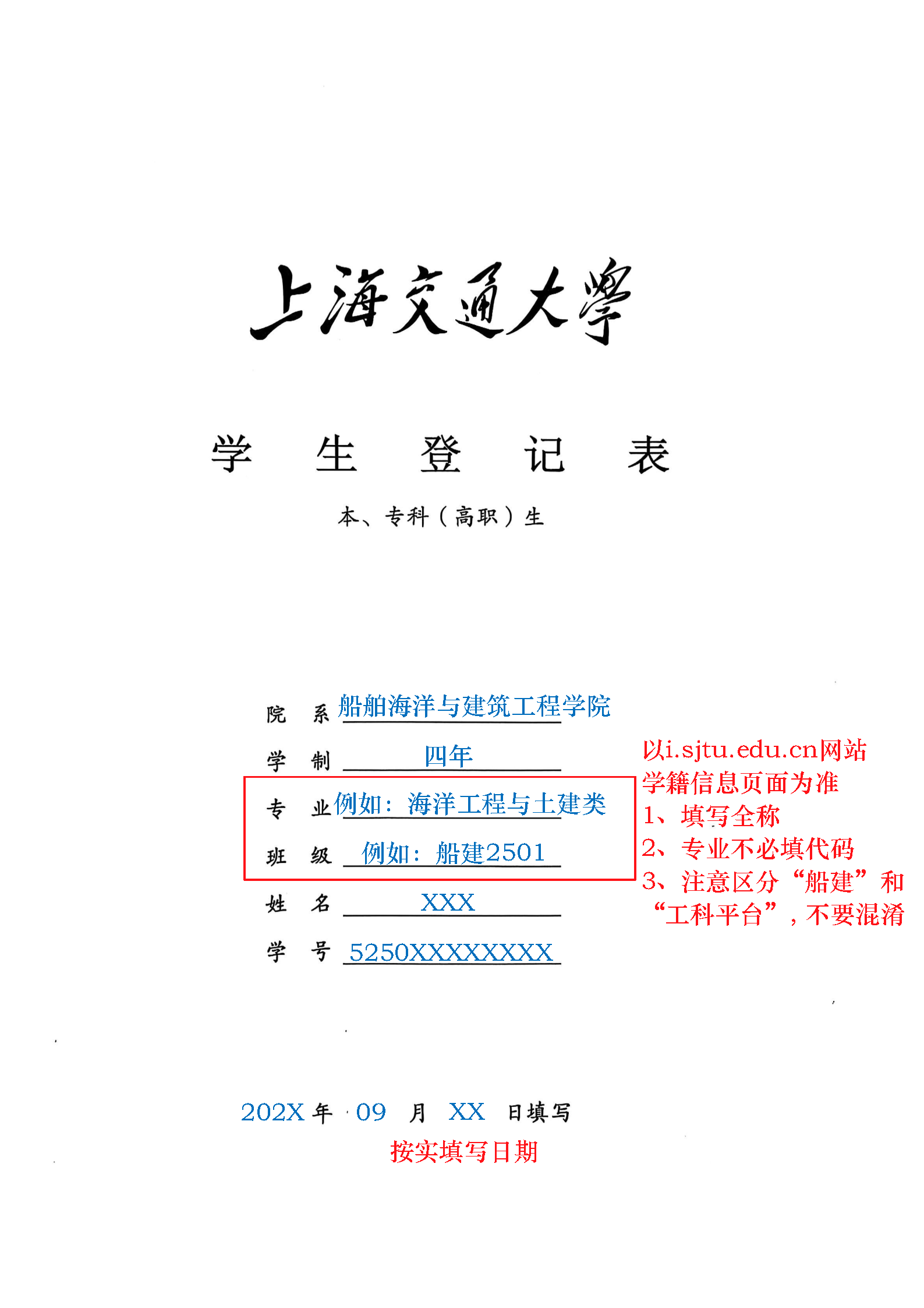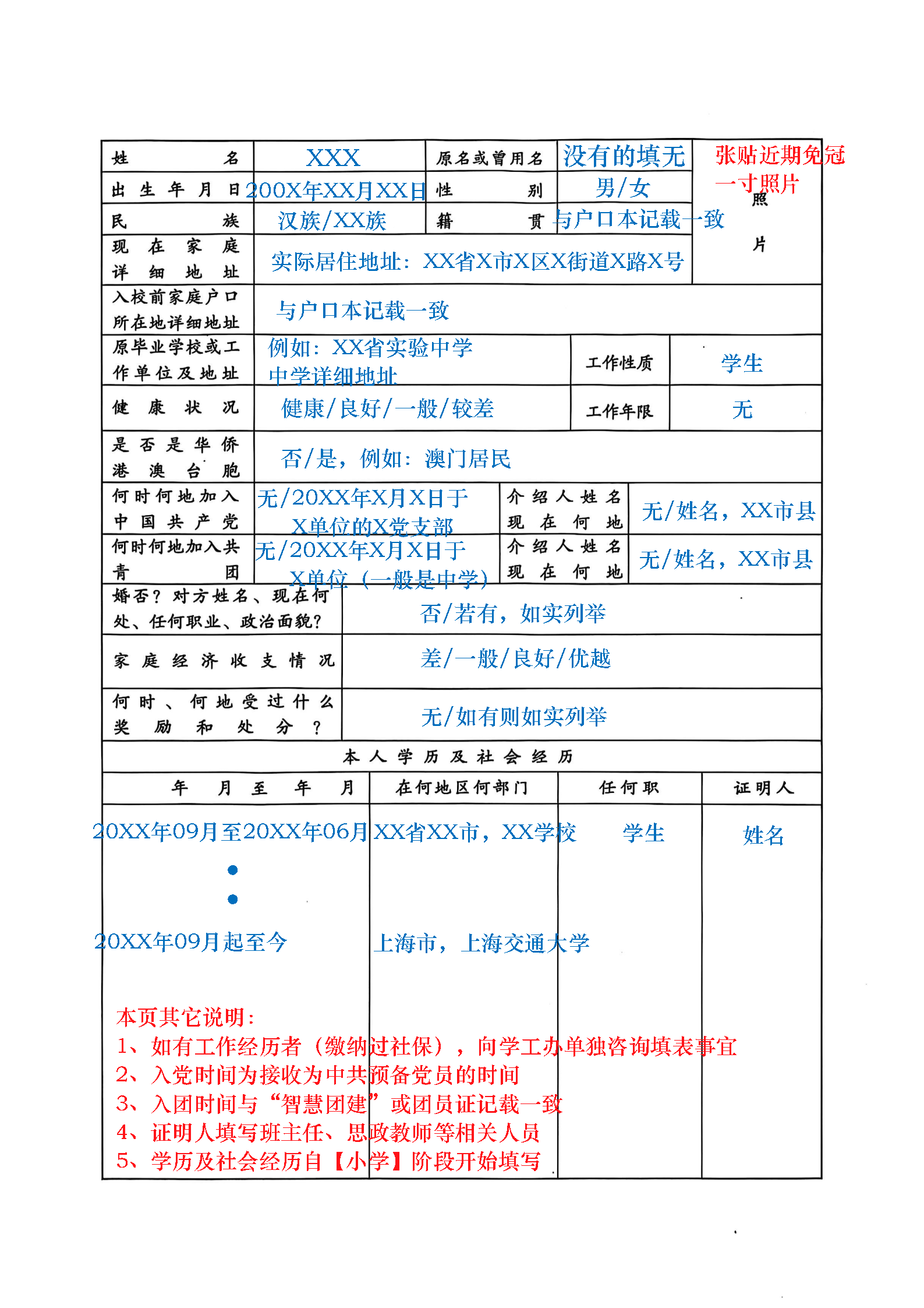 《上海交通大学学生登记表》(本科生入学登记表)填表说明
