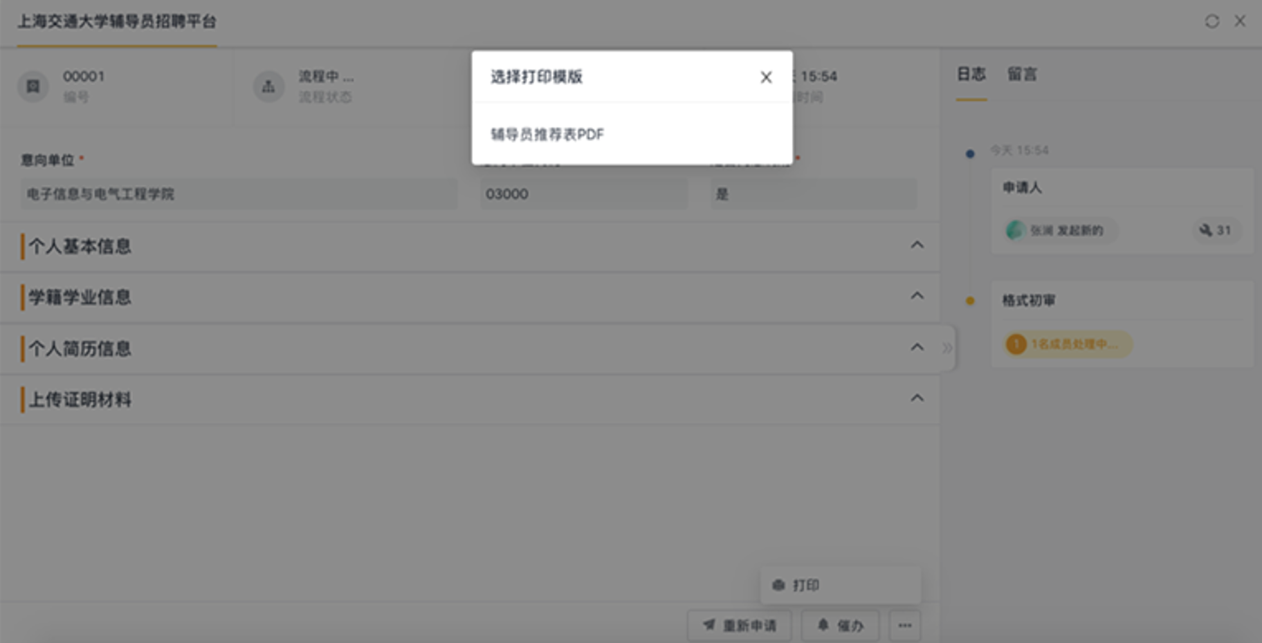 (点击右下角“…”,再选中打印“辅导员推荐表PDF”即可打印)
