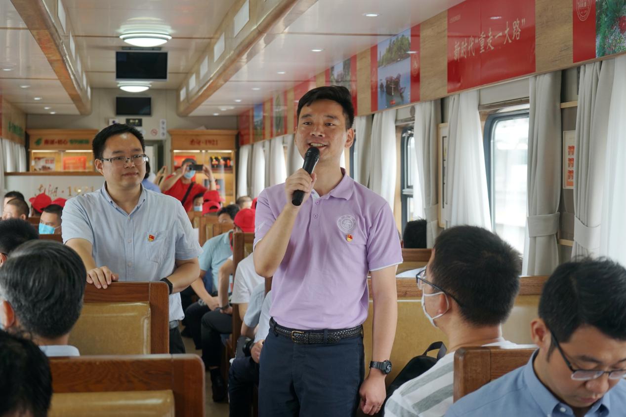 习近平总书记在七一重要讲话中指出,一百年来,中国共产党带领中国人民,以“为有牺牲多壮志,敢叫日月换新天”的大无畏气概,书写了中华民族几千年历史上最恢宏的史诗。铁路事业的发展是其中浓墨重彩的篇章。在“南湖·1921”红色专列上,上海交通大学党委常委、党委宣传部部长、凯发官网 “知行”社会实践临时党支部成员胡昊结合参与主题党日活动各个团队的特点,为大家上《学习百年党史,再创铁路辉煌》的专题党课。