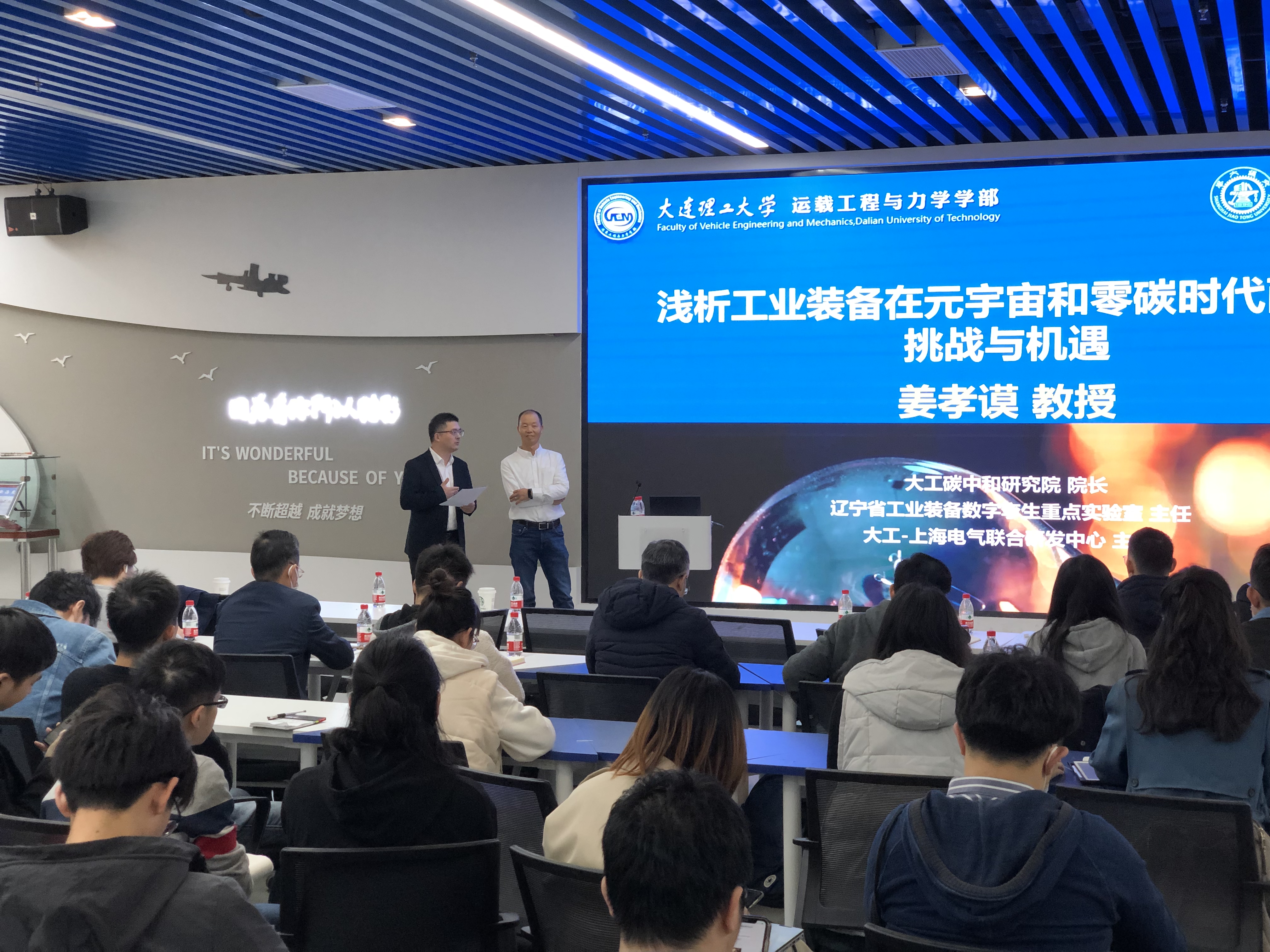 报告中,姜孝谟教授向师生介绍了元宇宙和零碳时代的背景,中国实现碳中和面临的各种挑战和机遇,重点探讨了工业装备智能化如何支撑实现国家双碳战略。