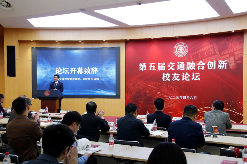 2023年4月8日下午,第五届交通融合创新校友论坛在闵行校区新图书馆图文信息楼八楼会议室举行。上海交通大学党委常委、副校长张安胜出席论坛并致辞,党委常委、宣传部部长胡昊致开幕辞。论坛邀请了河南省铁路建设投资集团有限公司党委书记、董事长悦国勇,上海船舶运输研究所原所长、中远海科原董事长蔡惠星,上海市粮食和物资储备局副局长、党组成员殷飞,申万菱信基金董事长陈晓升作主题报告。历届校友和在校师生百余人参加论坛活动。