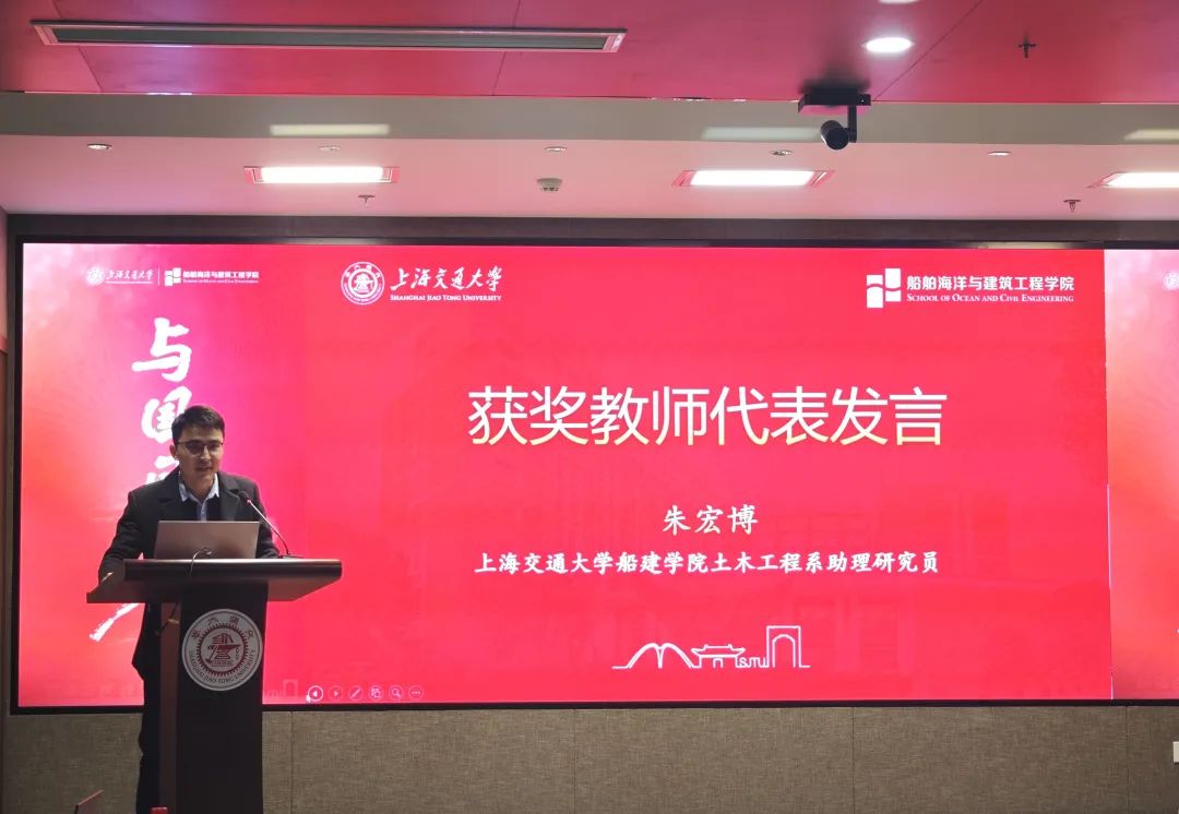 土木工程系朱宏博老师作为获奖教师代表发言,表达了对黄金枝教育发展基金会和学校的感激之情,表示黄金枝土木建筑奖研金为自身科研工作提供了关键支持与精神鼓舞。