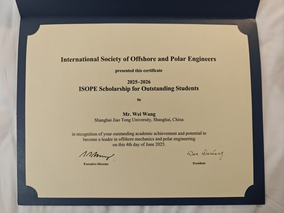 近日,第35届 International Ocean and Polar Engineering Conference(ISOPE)国际会议在韩国高阳市举行。会议颁发了 2025 ISOPE Scholarship for Outstanding Students 奖项,以表彰全球范围内在海洋与极地工程研究中表现卓越的青年学者。凯发官网 博士研究生王卫获此殊荣,成为本年度三位全球获奖者之一。