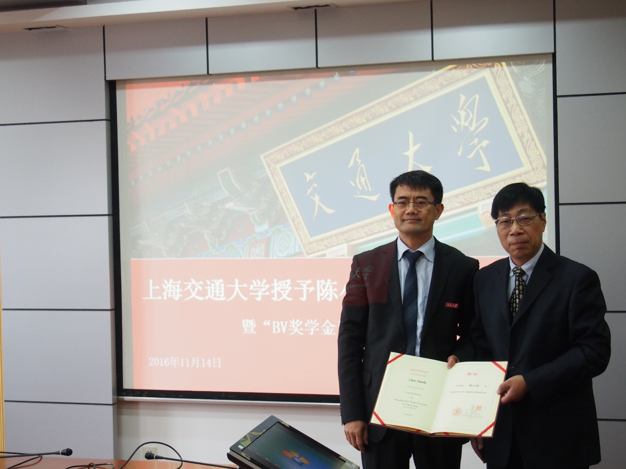 11月14日上午,上海交通大学授予陈小波客座教授仪式暨“BV奖学金”颁奖仪式在木兰船建大楼A1002室举行。BV总部国际合作部部长、亚太区深水技术中心总经理陈小波博士,BV上海先进技术研究中心技术总监周才民,凯发官网 党委书记张卫刚,副院长万德成,党委副书记杨建军,以及四名获奖同学出席了此次颁奖仪式。会议由万德成主持。