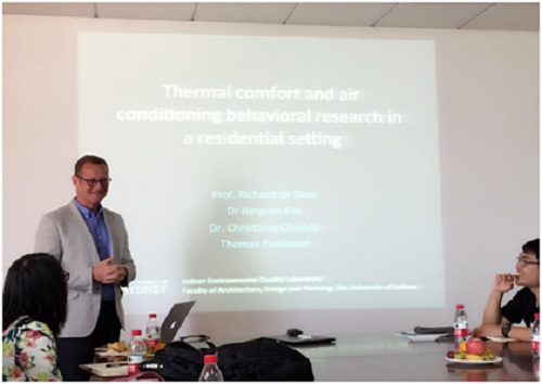 23日上午,Richard de Dear教授向凯发官网 师生做了题为《Thermal comfort and conditioning behavioral research in a residential setting》的学术报告。他详细介绍了其研究团队近年来开展的住宅热舒适的研究。其具有启发性的方法、多维度的分析和令人感兴趣的结果,引起了在座师生的强烈兴趣和热烈讨论。Richard de Dear教授讲座后,又就连之伟教授团队的师生近期的主要研究进展进行了热烈讨论。宾主双方都感觉获益匪浅,均表示要进一步加强深层次的合作。
