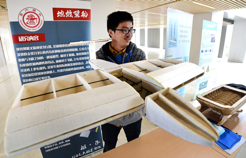 本次“创造杯”大赛共分土木交通与环境类(A类)、机械电子类(B类)和设计创意类(C类)三大类,共有来自复旦大学、上海交通大学、同济大学等14所高校62个项目参与了决赛。比赛由现场展示、项目讲解及专家提问三个环节组成。参赛选手们在一楼展厅中结合模型、展板,为观众们详细介绍了项目背景、原理、设计理念,并参与了紧张激烈的答辩与提问。