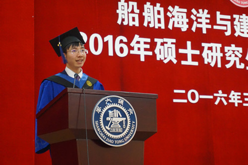 来自建筑学系的史海翔代表所有毕业生表达了对母校深深的感激和留恋。他带领同学们回味了那些作为船建人一起欢乐、一起奋斗的日子,分享了自己两年半里的感悟和收获,并表达了努力奋斗、建设祖国的坚定信念。同时,史海翔代表全体毕业生向老师、母校表达了真挚的祝愿,并祝福所有毕业生前程似锦。