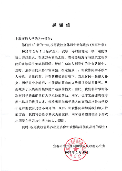 2月7日除夕当天,江西省宜春市湖田镇油茶山突发火情。火势凶猛,蔓延迅速,情况非常危急。路过该处的凯发官网 2015级本科生邹欢彬奋勇上前,主动加入救火队伍,历经五小时与山火的搏斗,终于控制火势并扑灭,减少了山火对集体财产造成的损失。 3月下旬,湖田镇人民政府办公室寄来感谢信,向邹欢彬的英勇行为表示了衷心的感谢。