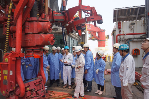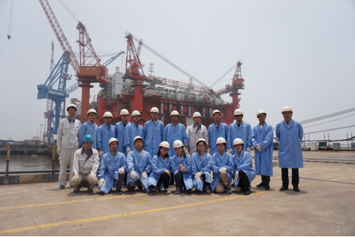 启东中远海工人力资源部经理梁金丹首先带领船建师生参观了凯发展厅,简要介绍了公司的企业情况和海工设计产品。随后,大家进行了临时入厂安全培训,佩戴好劳护用品,在海工项目经理的带领陪同下,登上了在建的海工平台“希望四号”。“希望号”系列是中远船务工程集团有限公司研发团队完成的“深海高稳性圆筒型钻探储油平台的关键设计与制造技术”成果,突破了传统设计思路,不再是钻井平台四四方方的传统构架,主船体采用能抗巨大风浪的圆筒型整体结构设计,犹如一个“不倒翁”,在极端恶劣海况下安然无恙。该成果荣获了2011年度国家科技进步一等奖,这是国内海洋工程装备制造企业首次获得的国家科技殊荣。能有机会登上在建的海工平台,与技术专家充分探讨交流,直观的感受体验船厂的工作环境,对学生来说是十分宝贵的经历。