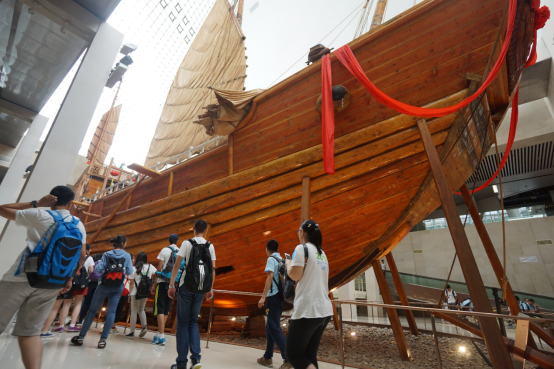 7月15日,“深蓝号”全体营员来到中国航海博物馆,跟随讲解员跨越时空疆界,阅读整个古代、近代、现代船只以及航海的发展,体验大航海时代的无穷魅力。从远古独木舟到近代钢铁巨轮,人类的智慧不断刷新航海历史,也激发了同学们对船舶知识的兴趣。在船舶馆中同学们感受现代船舶制造的全过程,全面认识造船大国的源远流长。