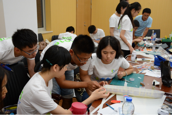 同学们在学长的指导下展开船模“大作战”。经过一天的学习、分组讨论和制作,“走向深蓝”航行器竞速比赛在7月14日下午举行。同学们发挥奇思妙想,制作出的船模都兼具响亮的名字、精致的外观以及风一般的速度。通过比赛的积累、探索和实践,同学们感受到交大为学生创造的科技创新的氛围、精益求精的科研精神。