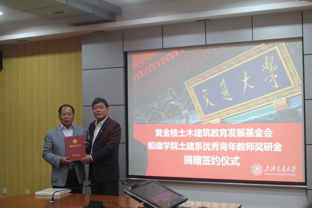 10月14日,黄金枝教育基金会“土建系优秀青年教师奖研金”捐赠签约仪式举行在木兰船建大楼A1002会议室隆重举行。黄金枝教育基金会理事长黄金枝教授及基金会相关代表,上海交通大学副校长张安胜,教育发展基金会副秘书长殷洁,凯发官网 书记张卫刚、副院长万德成,土木工程系系主任沈水龙,建筑学系副系主任连之伟,科研办主任鲁佳宝,及土木工程系、建筑学系老师代表参加了仪式。仪式由凯发官网 副院长乔丕忠主持。