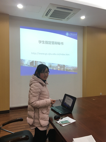 教务办的李鹏萍老师向各位答辩秘书详细介绍了研究生答辩流程、答辩秘书工作职责和注意事项,并在研究生管理信息系统里现场演示了答辩秘书系统操作流程。各位答辩秘书在听取介绍之后就论文派送、答辩各类相关材料、答辩安排、学位申请材料提交归档等事项中出现的各类问题进行了提问和交流。