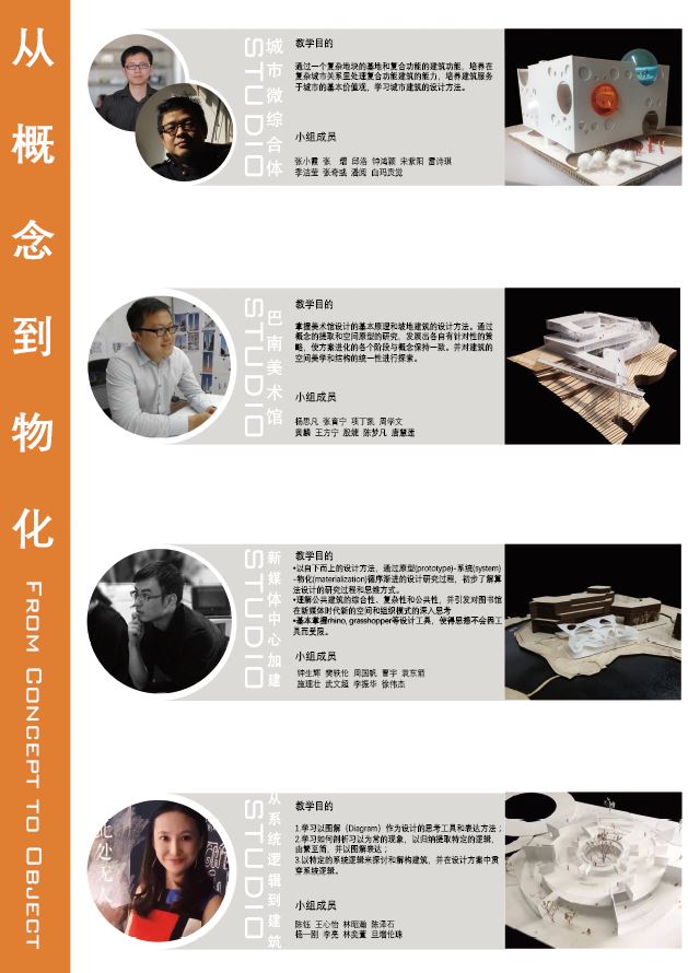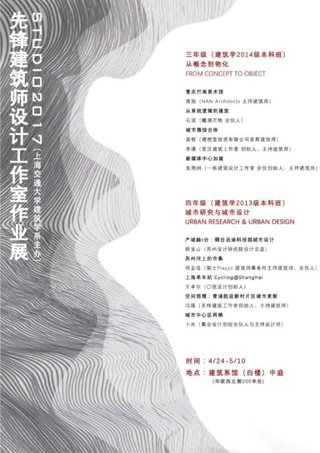 外一批优秀实践建筑师,其作品的学术性、探索性都走在专业前列,引领专业发展,在学生中影响力日益增强,一些排名靠前的高校也开始聘请优秀实践建筑师完整指导设计课。 上海交大建筑学系“先锋建筑师设计工作室(Studio)”项目最早尝试于2011年,2014年春季学期在三、四年级全面铺开,是国内高校最早引入优秀实践建筑师指导设计课的学校之一。2017年春季学期,建筑学系举办了“第四届先锋建筑师设计工作室(Studio)”。我们从交大建筑学专业规模小、没有历史负担、学生素质优、学校平台高等特点,以及培养“具备工程缜密思考,同时能够反思与突破的优秀专业人才”目标出发,邀请了九组(十名)兼具实践性与学术性、具备专业反思能力,在国内、国际建筑界具有一定知名度、或初露锋芒的“研究型”先锋实践建筑师,走进校园,指导本科三、四年级各一个为期八周的设计课题。 三年级课题《从概念到物化(From Concept to Object)》——训练学生理性提取设计概念,并用建筑本体手段予以物化的方法与能力。导师包括:栋栖建筑合伙创始人张朔炯;NAN Architects主创建筑师南旭;尺墨设计|CMO Design联合创始人、主持建筑师石溪;德懋堂投资有限公司首席建筑师袁牧+普泛建筑工作室主持建筑师李谦。 四年级课题《城市研究与城市设计(Urban Design an Urban Research)》——训练学生对城市的理解,并学习相关研究与设计技能。导师包括:苏州设计研究院赛德凯发