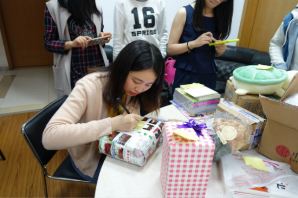 4月26日下午,青志队完成认领信息的确认之后,F1601001团支部于木兰船建大楼展开了心愿的收集与打包活动。同学们准备了带有交大特色的明信片,写下对孩子们的祝福。收集完微心愿礼物之后,F1601001团支部的同学们将它们寄往了苏布尔嘎镇中心小学,期待着与孩子们的进一步交流。