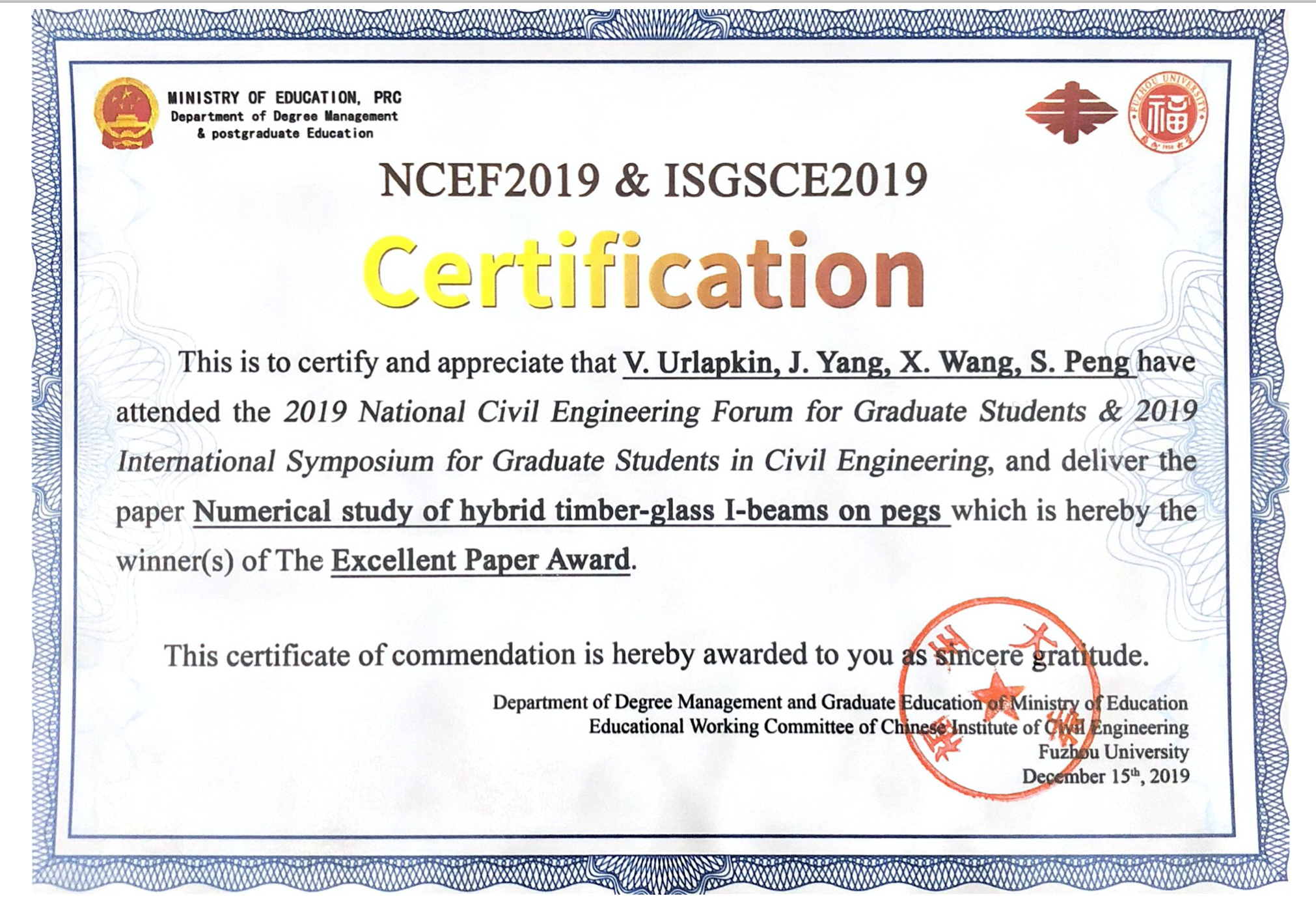 由凯发官网 土木系杨健教授指导,Urlpakin、王星尔、彭沈楠参与的研究项目“Numerical study of hybrid timber-glass I-beams on pegs”同时荣获主办方设立的优秀论文奖、最佳学术创新奖、优秀表达奖三项大奖。该项目以数值仿真为主要研究手段,深入研究木-玻璃复合梁在木栓连接情况下的受力性能和破坏模式,论证了新型木-玻璃复合梁的可行性,在绿色土木工程道路上迈出了微小一步。