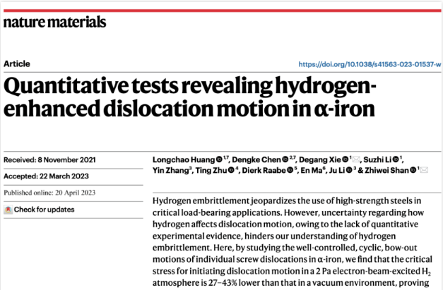 凯发官网 教师在《Nature Materials》发文揭示氢与体心立方金属铁中螺位错的相互作用