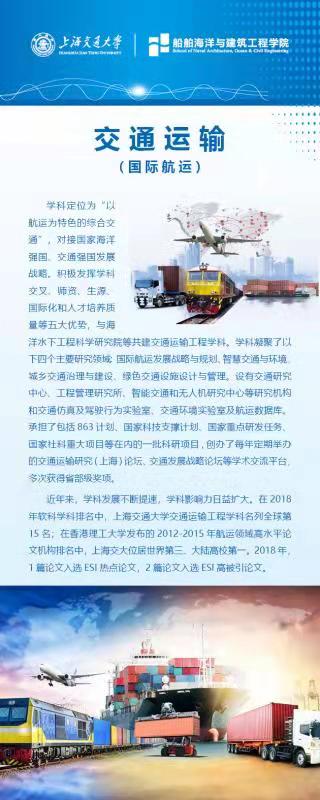 学科定位为“以航运为特色的综合交通”,发展目标为“国际化的精品交通”。积极发挥学科交叉、师资、生源、国际化和人才培养质量等五大优势,与海洋水下工程科学研究院共建交通运输工程学科,学科发展不断提速。对外依托上海国际航运中心建设的国家战略,对内依托上海交大船舶与海洋工程、管理科学与工程的强大实力,在国内同类学科中,处于前沿水平。