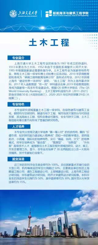 上海交通大学土木工程专业历史悠久,早在1907年学校就设立了铁道科,成为我国历史上最早设立土木工程专业的院校之一。交大土木工程学科人才辈出,校友包括茅以升、张光斗、孙均、刘建航院士等著名学者。1952年院系调整并入同济大学,1985年恢复。